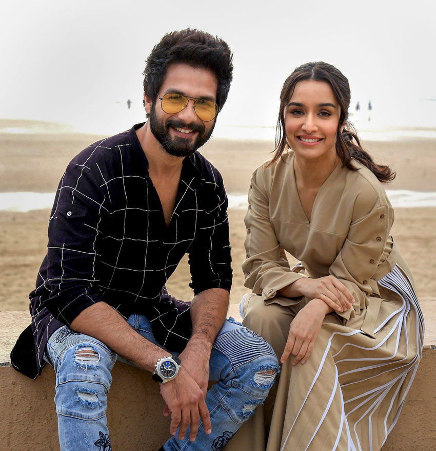 Shraddha Kapoor (r) and Shahid Kapoor pose during a media interaction for their upcoming film ‘Batti Gul Meter Chalu,’ in Mumbai, Aug. 28. (Press Trust of India)