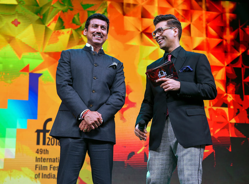 Union I&B Minister Rajyavardhan Rathore and filmmaker Karan Johar during the opening ceremony of IFFI 2018, in Panaji, Tuesday, Nov. 20, 2018. (PTI/Shirish Shete)
