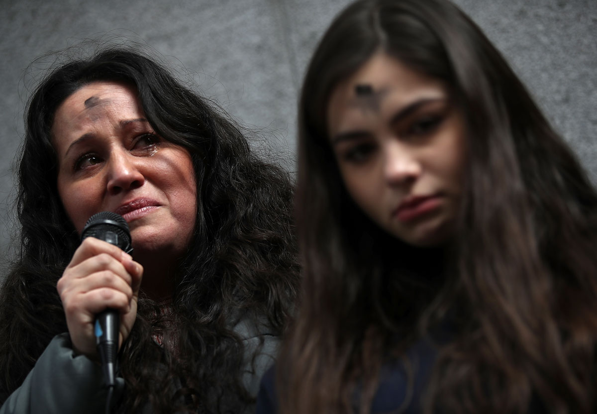 Lourdes Barraza, (l) wife of detained immigrant Fernando Barraza, fights back tears as she speaks during a Valentine’s Day demonstration outside of the San Francisco office of the Immigration and Cutsoms Enforcement (ICE), Feb. 14, in San Francisco. Dozens of immigration activists and faith leaders staged a Vaentine’s Day demonstration outside of the ICE offices in San Francisco to denounce detained immigrants and the lack of progress with DACA. (Justin Sullivan/Getty Images)