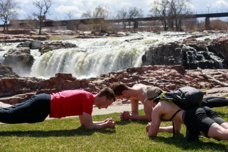 Lane Stone (L) and his friends work out along the waterfalls in Sioux Falls, South Dakota, where no lockdown has been imposed despite the coronavirus pandemic (Kerem Yucel)