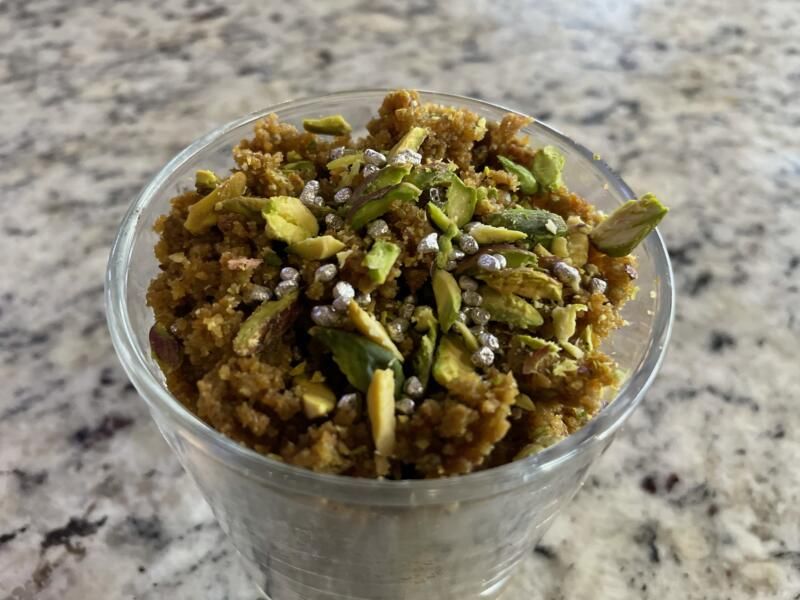 Garnish with pistachio slices, shedded coconut and silver cardamom seeds.