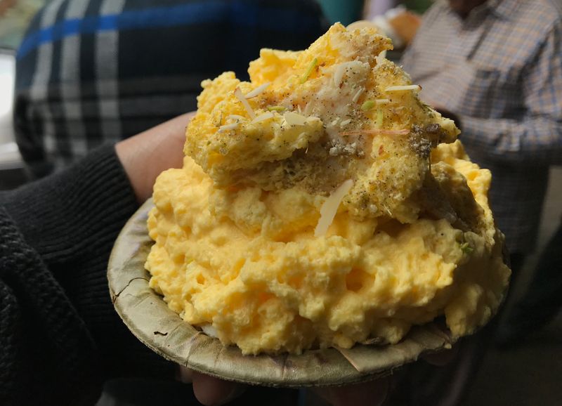 “Maakhan,” a sweet buttery dessert is prepared from sweetened milk that is kept overnight in the mist, then garnished with saffron and dry fruits. This delicious street dessert is a staple of Uttar Pradesh. To try this, you have to brave the winter chill, early in the morning. (Vansh A. Gupta/Siliconeer)