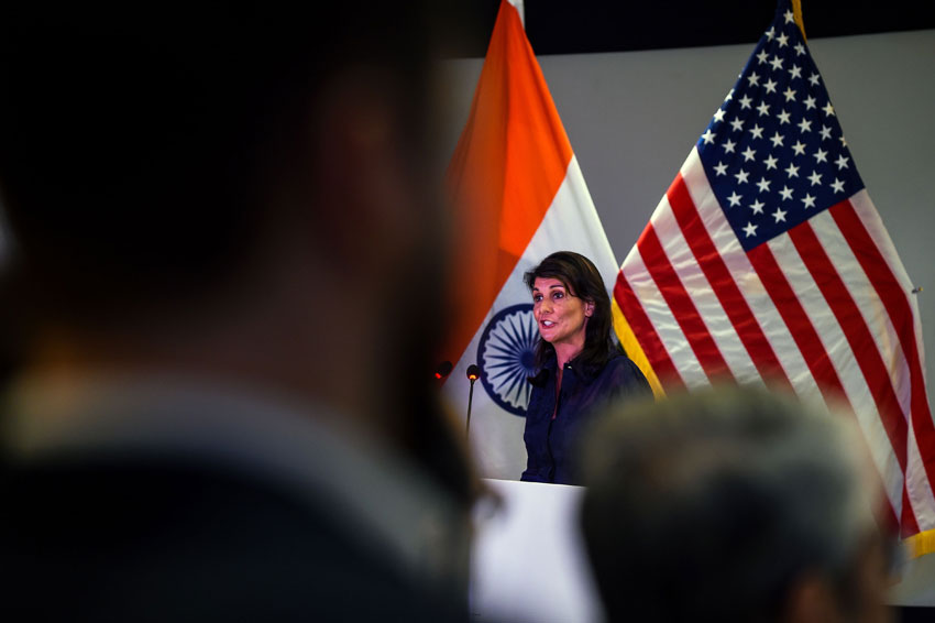 U.S. Ambassador to the United Nations Nikki Haley speaks during an address on advancing India-U.S. relations at an event in New Delhi, June 28. Haley was on a two-day visit to India. (Chandan Khanna/AFP/Getty Images)