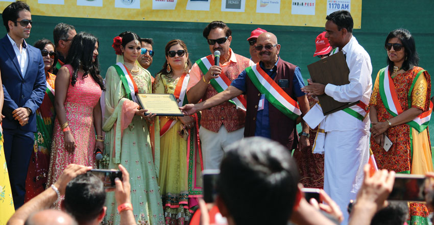 FOG Convenor Romesh Japra (c) with Tusshar Kapoor (l), Tanishaa Mukerji (holding plaque) and Rajesh Verma (holding plaque) along with others at India Day celebrations in Fremont, Calif., Aug. 19. (Ritu Maheshwari)