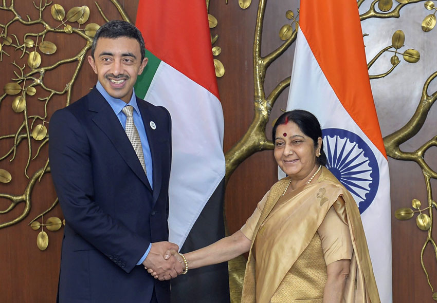 Indian External Affairs Minister Sushma Swaraj seen here with UAE’s Foreign Minister Sheikh Abdullah Bin Zayed Al Nahyan (l) during their meeting, in New Delhi, June 25. (Manvender Vashist/PTI)