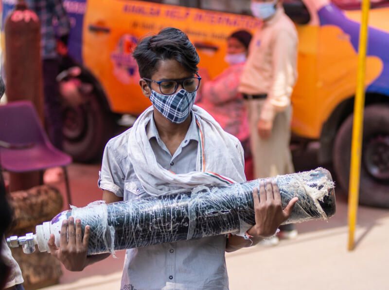 Young boy in India holds an oxygen tank during the most devastating spread of COVID-19