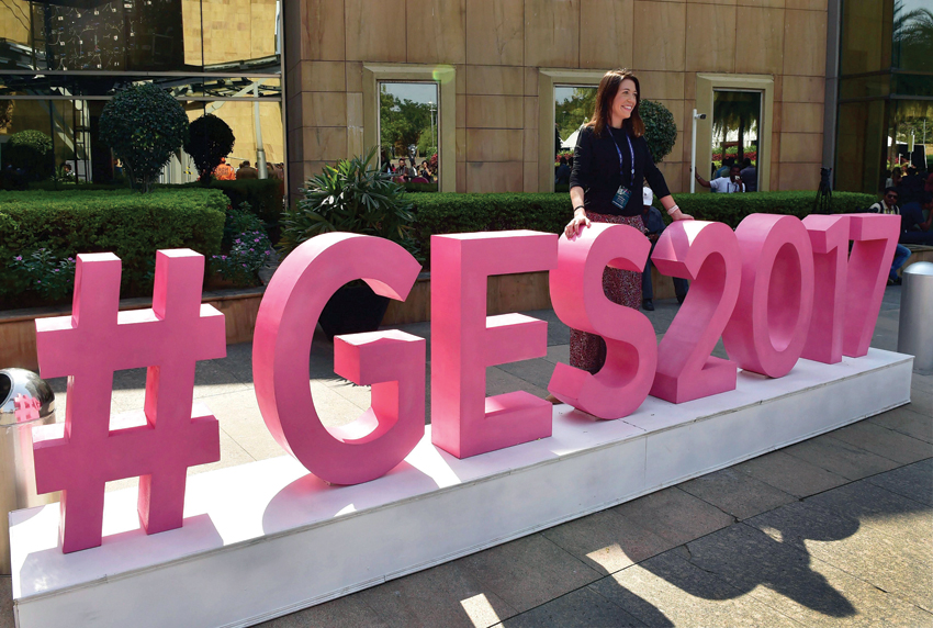 A delegate poses for a photo at the venue of the Global Entrepreneurship Summit 2017 in Hyderabad, Nov. 28. (Shailendra Bhojak/PTI)