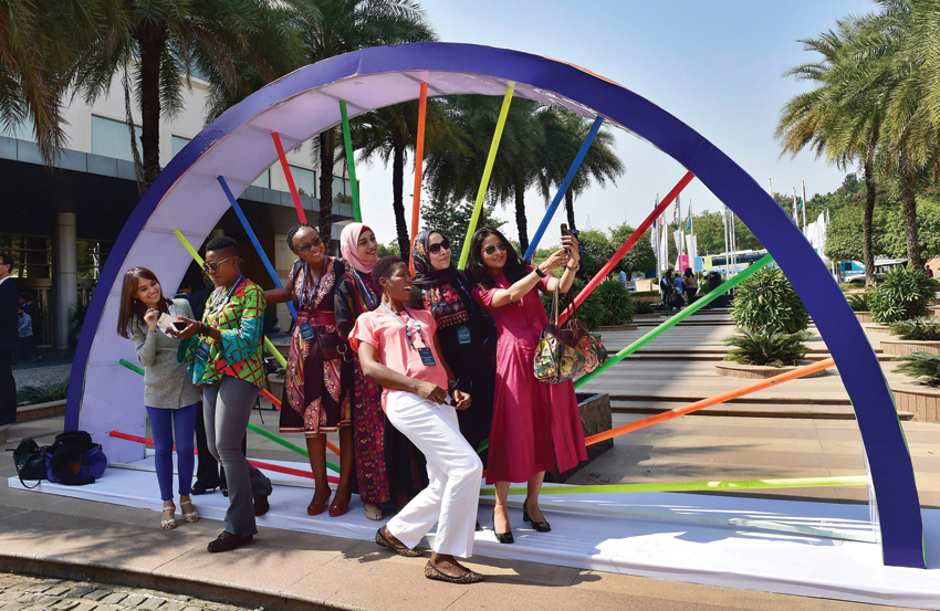 Delegates pose for a photo at the venue of the Global Entrepreneurship Summit 2017 in Hyderabad, Nov. 28. (Shailendra Bhojak/PTI)