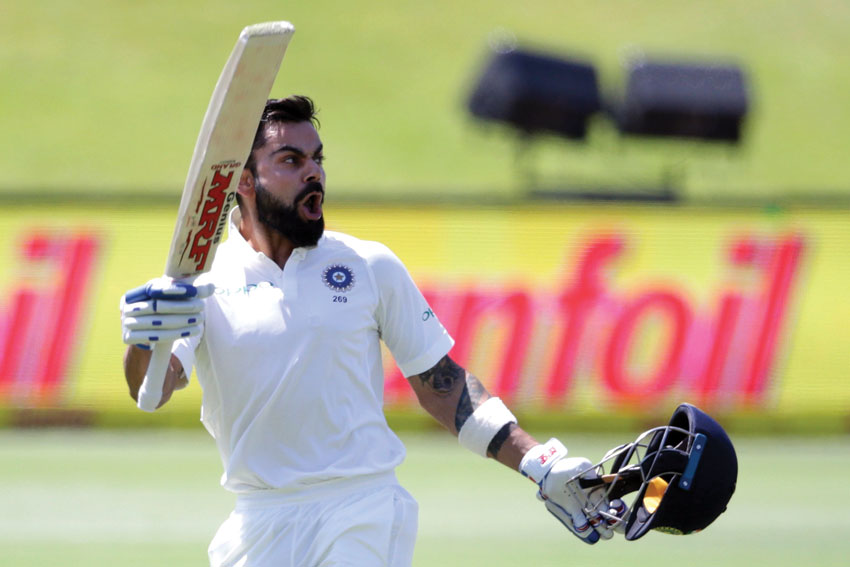 Indian Skipper Virat Kohli raises his bat and helmet as he celebrates scoring a century (100 runs) during the third day of the second Test cricket match between South Africa and India at Supersport Cricket Ground on Jan. 15, in Centurion, South Africa. (Gianluigi Guercia/AFP/Getty Images)