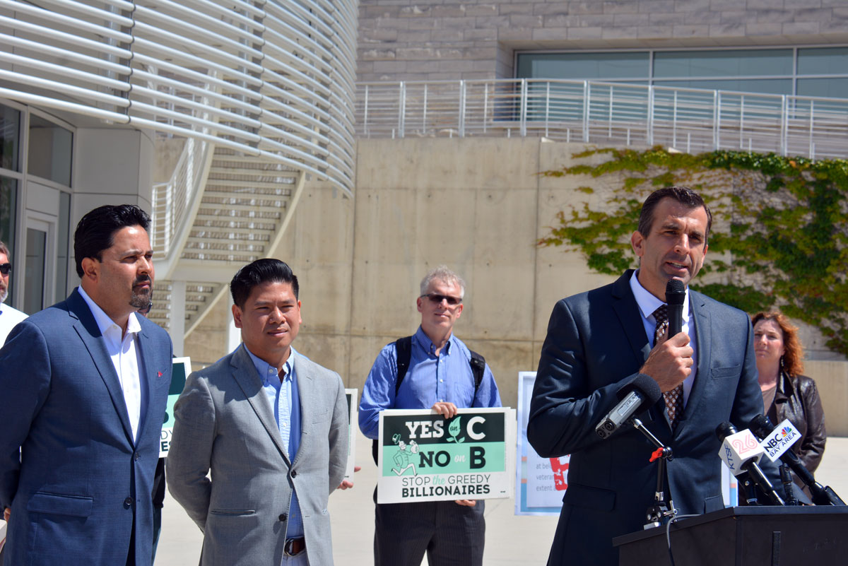 San Jose Mayor Sam Liccardo (r) speaks in favor of Measure C as his council members from Vietnamese and Spanish community look on. (Amar D. Gupta/Siliconeer)