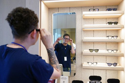 Meta experience expert Askia Luna demonstrates the Ray Ban Stories smart glasses during a preview of the store in Burlingame, Calif., Wednesday, May 4, 2022. (AP Photo/Eric Risberg)