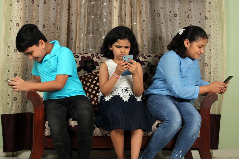 (Above): Technology spoiling Indian childhood – kids are busy using smartphone while sitting on a couch, indoors. (Shutterstock)