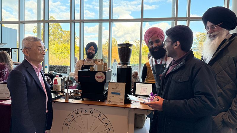Vansh Gupta (r) in conversation with Bill Imada (l) and Roaming Bean Coffee owner Jasraj Sangha.