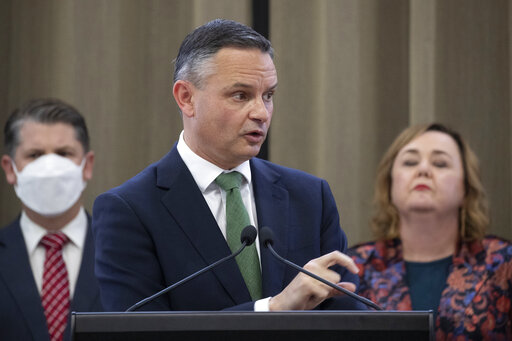 New Zealand Climate Change Minister James Shaw announces the government’s emissions reduction plan at Parliament in Wellington, New Zealand Monday, May 16, 2022. New Zealand will help pay for lower-income families to scrap their old gas guzzlers and replace them with cleaner hybrid or electric cars as part of a sweeping plan to reduce greenhouse gas emissions. (Mark Mitchel/ NZ Herald via AP)