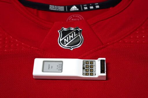 A sensor is shown with a Detroit Red Wings NHL hockey jersey, Tuesday, Oct. 5, 2021, in Detroit. The NHL is using real-time tracking technology in pucks and on the back of players’ jerseys, shooting to generate more data for teams, broadcasters, fans and gamblers. (AP Photo/Paul Sancya)