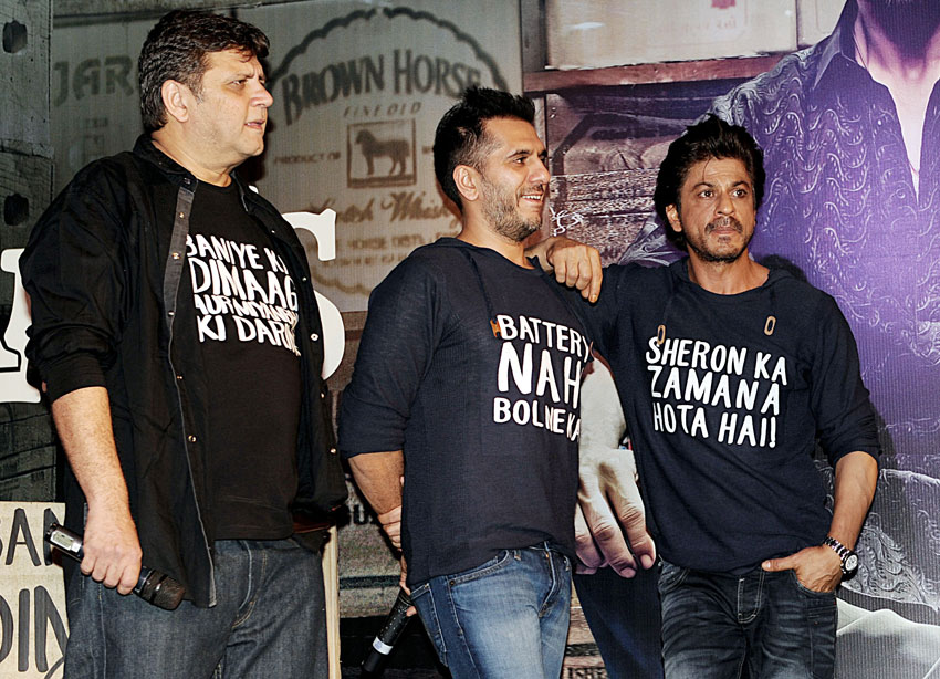 Indian Bollywood actor Shah Rukh Khan (R), producer Ritesh Sidhwani (C) and director Rahul Dholakia pose for a photograph during a promotional event for the Hindi film ‘Raees’ in Mumbai, January 30, 2017. (STR/AFP/Getty Images)