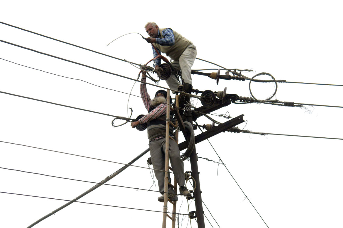 Employees of the Indian Punjab State Power Corporation Limited repair electrical wires in Amritsar, March 9, 2017. (Narinder Nanu/AFP/Getty Images)