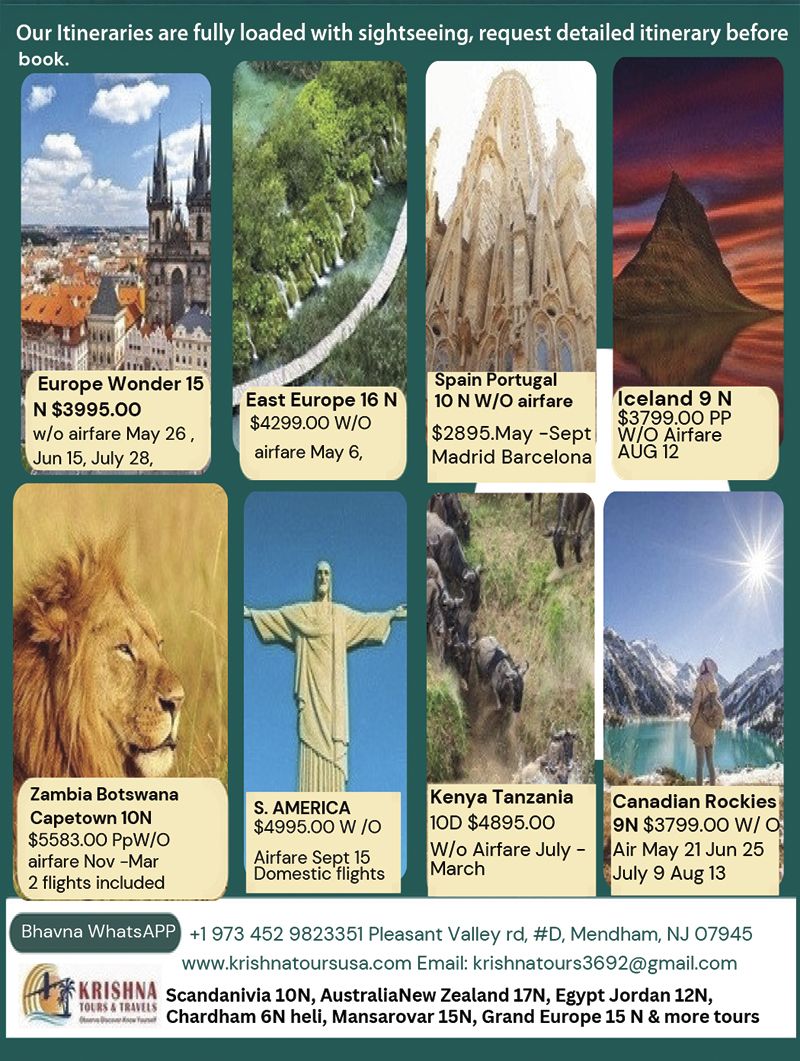 Other tours offered: Scandanivia 10N, Australia/New Zealand 17N, Egypt/Jordan 12N, Chardham 6N heli, Mansarovar 15N, Grand Europe 15 N & more tours.