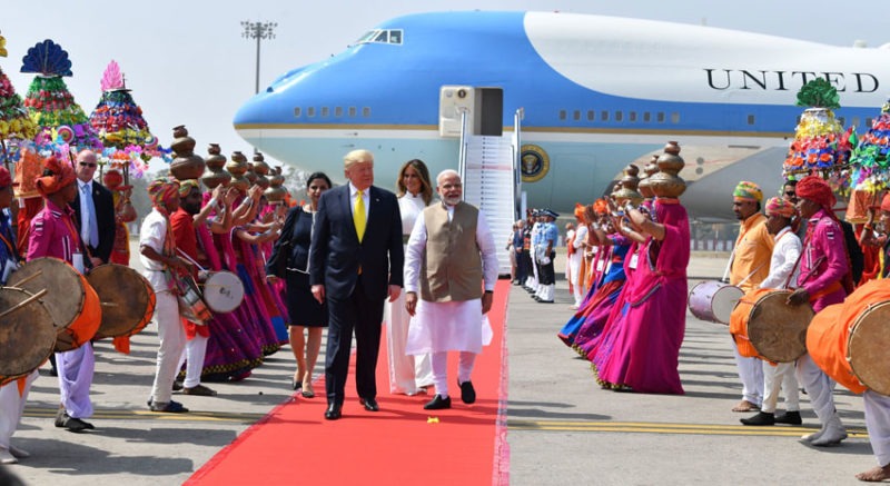 (Above): Indian Prime Minister Narendra Modi (r) welcoming U.S. President Donald Trump and First Lady Melania Trump, on their arrival at Sardar Vallabhbhai Patel International Airport, at Ahmedabad, Gujarat, Feb. 24. (PIB)
