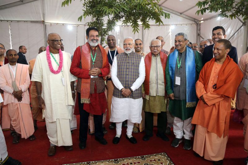 Prime Minister Modi began the ceremony by paying homage to Srila Prabhupada, the inspiration behind Akshaya Patra’s meal program. Chanchalapathi Dasa welcomed and felicitated the dignitaries. An invocation was sung by Akshaya Patra beneficiaries from Vrindavan. It was followed by speeches by Yogi Adityanath, Mohandas Pai, and Madhu Pandit Dasa.