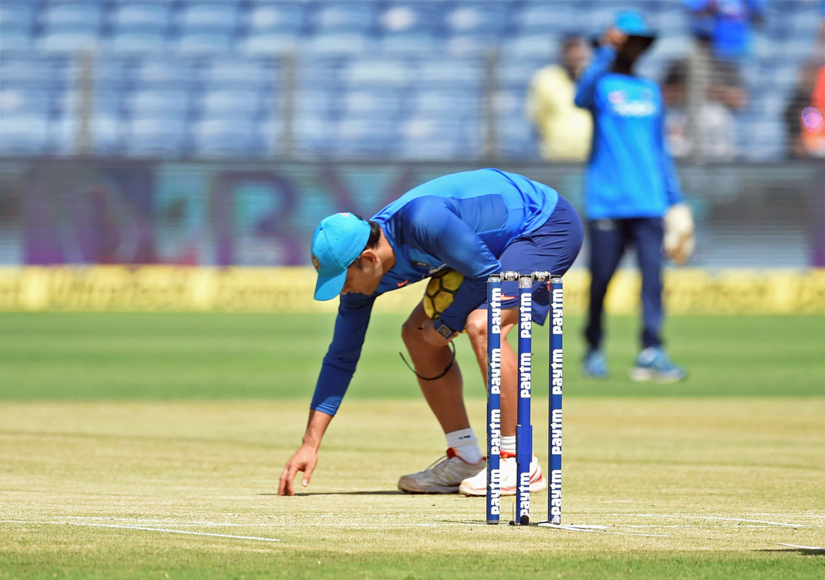 M.S. Dhoni inspects the pitch ahead of the 2nd ODI cricket match against New Zealand in Pune, Maharashtra, Oct. 25. (Shashank Parade/PTI)