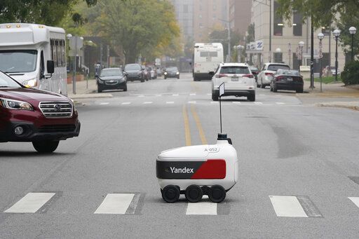 A food delivery robot crosses a street in Ann Arbor, Mich. on Thursday, Oct. 7, 2021. Robot food delivery is no longer the stuff of science fiction. Hundreds of little robots __ knee-high and able to hold around four large pizzas __ are now navigating college campuses and even some city sidewalks in the U.S., the U.K. and elsewhere. While robots were being tested in limited numbers before the coronavirus hit, the companies building them say pandemic-related labor shortages and a growing preference for contactless delivery have accelerated their deployment. (AP Photo/Carlos Osorio)