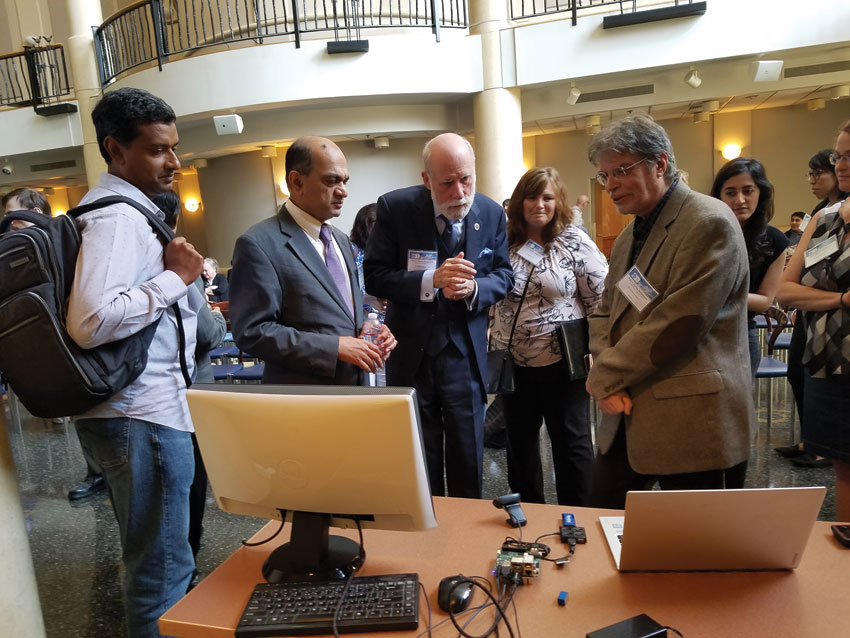 Dr. Cerf watching the Intel Innovator PeopleSense Demo and Intel Movidius Neural Compute Stick. (Harsh Verma/ACM Sacramento)