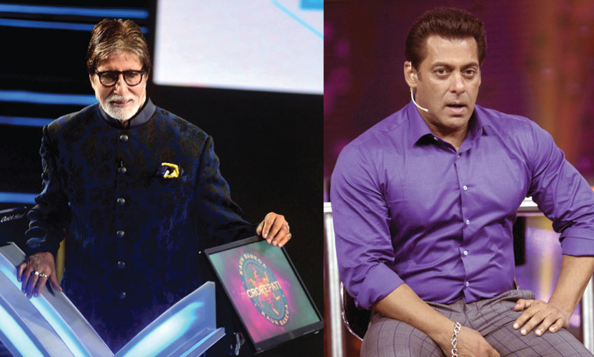 (Left): Amitabh Bachchan at a press conference for ‘Kaun Banega Crorepati’ season 10, in Mumbai, Aug. 28. (Right): Salman Khan hosts reality show ’10 Ka Dum,’ in Mumbai, May 28. (Press Trust of India)