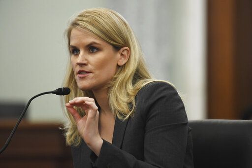 FILE – Former Facebook employee and whistleblower Frances Haugen testifies during a Senate Committee on Commerce, Science, and Transportation hearing on Capitol Hill on Tuesday, Oct. 5, 2021, in Washington. Haugen made a significant mark on the embattled tech industry in 2021. (Matt McClain/The Washington Post via AP, Pool, File)