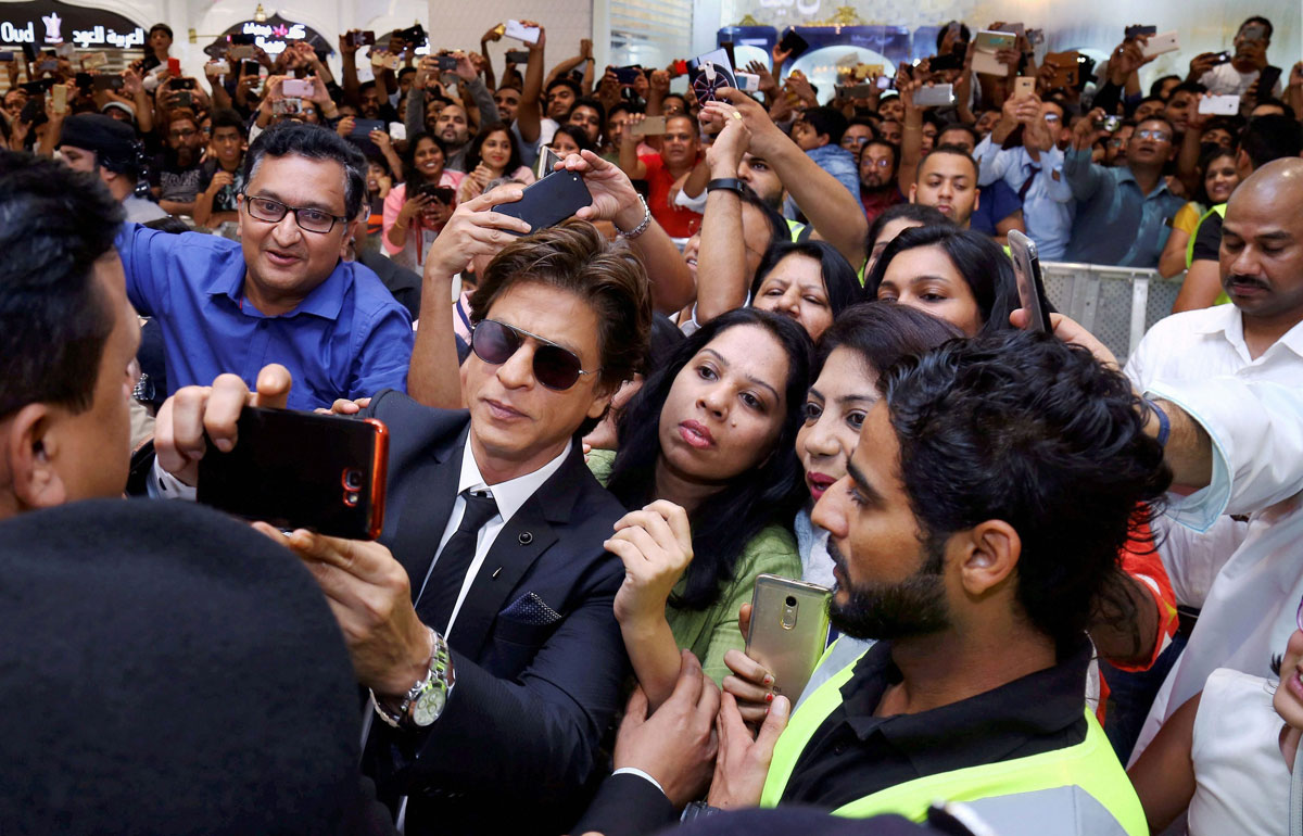 Shah Rukh Khan clicks selfies with his fans during the inauguration of a jewelry showroom, in Muscat, Dec. 30. (Press Trust of India)