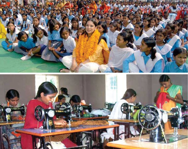 (Above): (Top): Shabana Azmi (c) with children at Mijwan Welfare Society, an NGO that works for the empowerment of villagers in Mijwan in Azamgarh, Uttar Pradesh, India. (Bottom): A known feminist, Kaifi Azmi was focused to uplift the lives of rural women. He started a training school for tailoring and embroidery for girls in Mijwan, U.P. This center is funded by an U.S.-based non-profit organization Home of Hope, Inc.