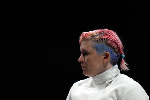 Courtney Hurley of the United States prepares to compete against Hsieh Kaylin Sin Yan of Hong Kong in the women’s individual Epee Team classification 5-8 competition at the 2020 Summer Olympics, Tuesday, July 27, 2021, in Chiba, Japan. (AP Photo/Hassan Ammar)