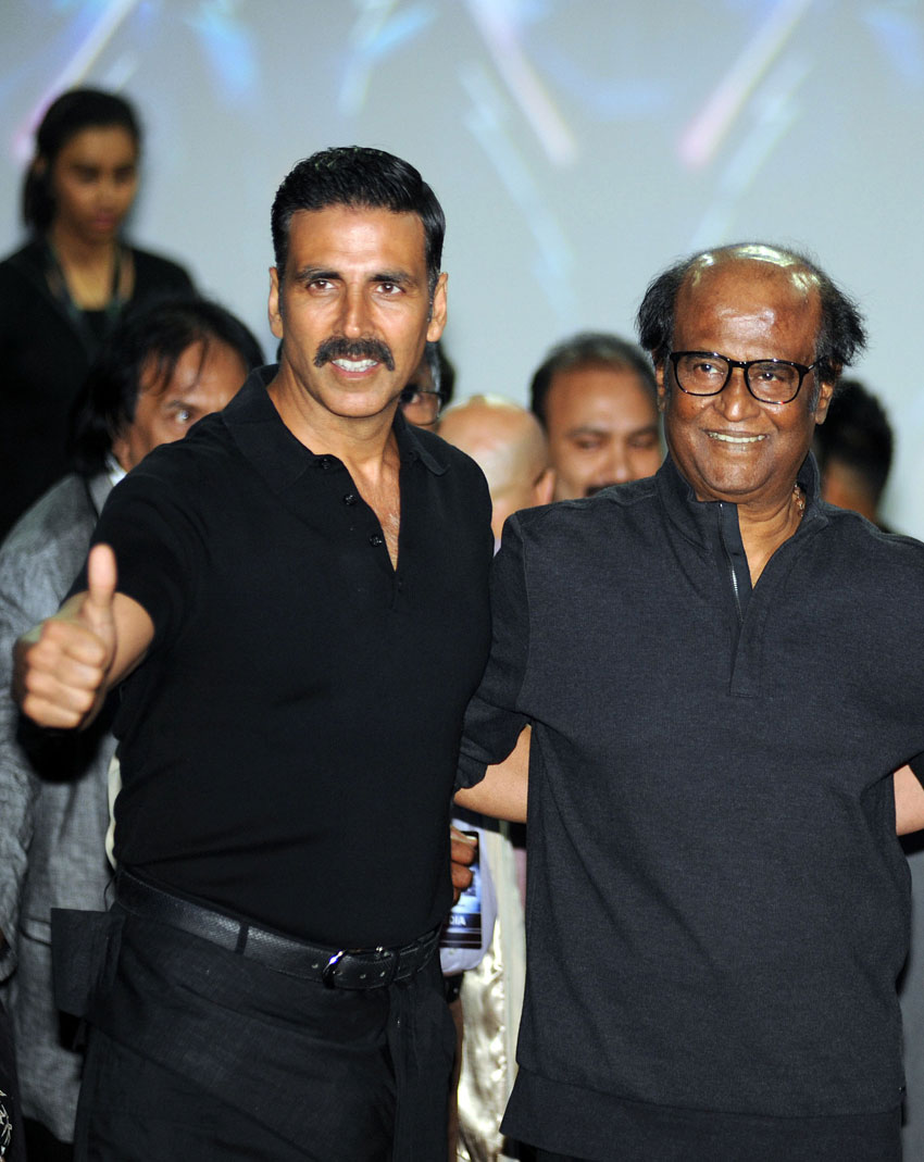 File photo of Akshay Kumar (l) and Rajinikanth at a promotional event for science fiction Hindi film ‘2.O’ written and directed by S. Shankar, in Mumbai, Nov. 20, 2016. (AFP/Getty Images)