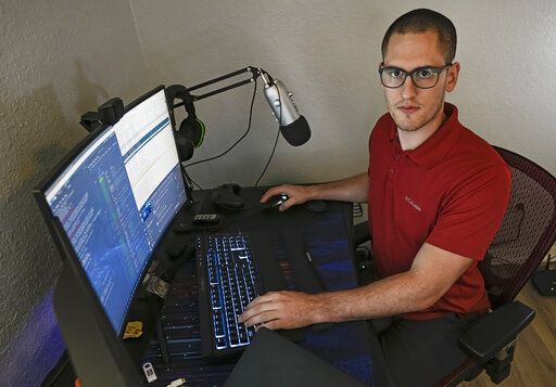 In this Sept. 20, 2021, photo Austin Moody poses for a photo as he sits a his home work station in Tampa, Fla. Moody, the Michigan native, got a scholarship from the Department of Defense that required working for the agency at least a year after graduating. Moody said he understands that state governments don’t have the kind of money that federal agencies or private companies spend on recruiting and generous salaries. (AP Photo/Steve Nesius)