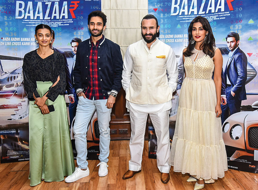 (L-r) Radhika Apte, Rohan Mehra, Saif Ali Khan and Chitrangada Singh promote their film ‘Baazaar’ in New Delhi, Oct. 22. (Press Trust of India)