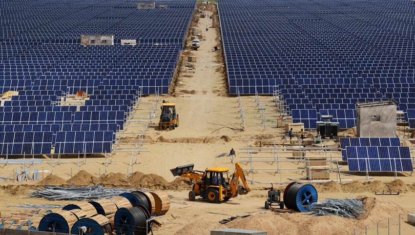 In this photograph taken on Aug. 23, 2015, a general view shows construction taking place at Roha Dyechem solar plant at Bhadla some 225 kms north of Jodhpur in the western Indian state of Rajasthan. Under a blistering sun, workers install a sea of solar panels in a north Indian desert as part of the government’s clean energy push. (Money Sharma/AFP/Getty Images)