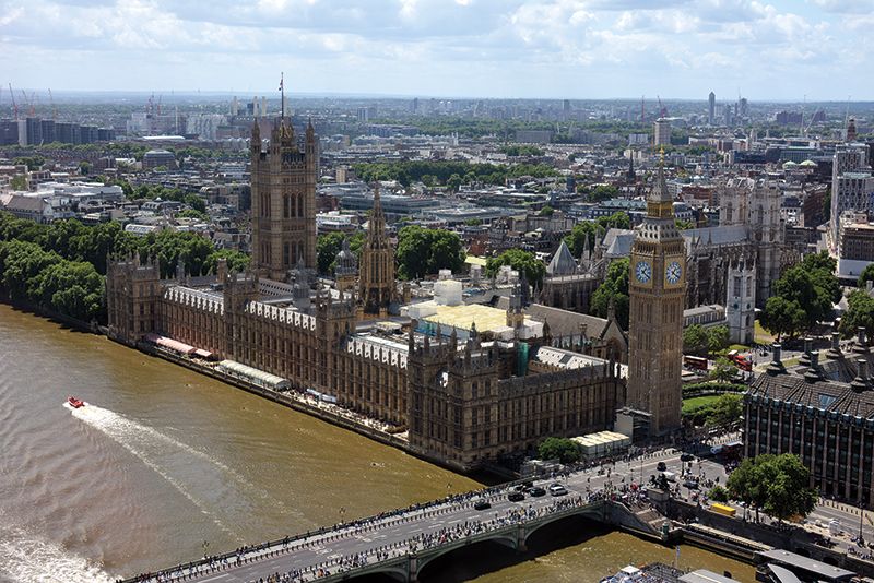 Aerial view of Westminster Bridge, Big Ben, and Westminster Palace from the London Eye