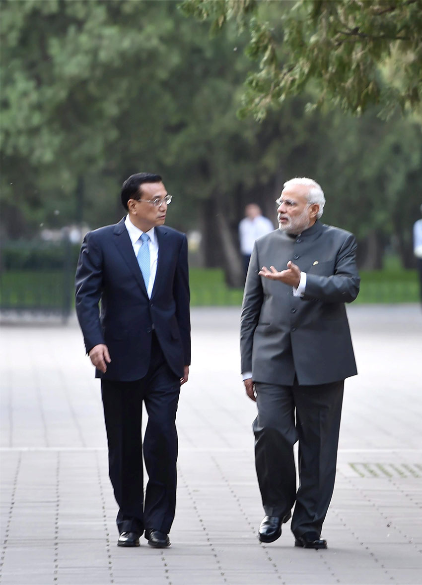 Prime Minister Narendra Modi with Chinese Premier Li Keqiang during a visit to the Temple of Heaven in Beijing, May 15. (Shahbaz Khan | PTI)