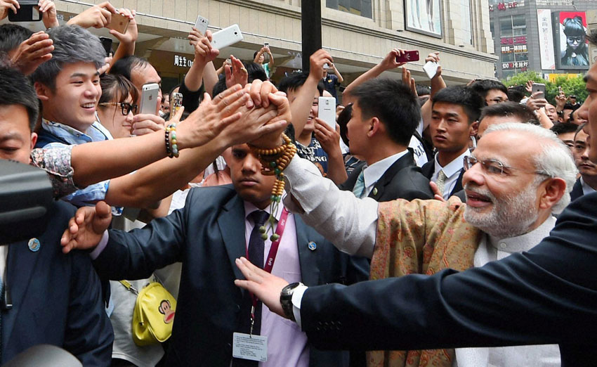Prime Minister Narendra Modi interacting with the people near the Daxingshan temple in Xi’an, China, May 14. (Shahbaz Khan | PTI)