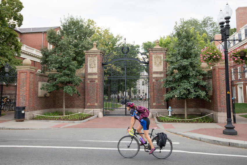 A bicyclist rides past a gate to Harvard Yard at Harvard University, Aug. 30, in Cambridge, Massachusetts. The U.S. Justice Department sided with Asian Americans suing Harvard over admissions policy. (Scott Eisen/Getty Images)
