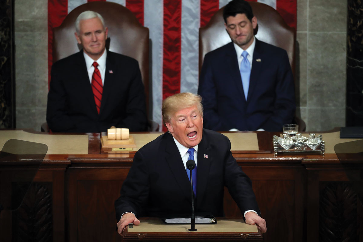 President Donald J. Trump delivers the State of the Union address as U.S. Vice President Mike Pence (l) and Speaker of the House U.S. Rep. Paul Ryan (R-WI) (r) look on in the chamber of the U.S. House of Representatives, Jan. 30, in Washington, D.C. This is the first State of the Union address given by President Donald Trump and his second joint-session address to Congress. (Chip Somodevilla/Getty Images)