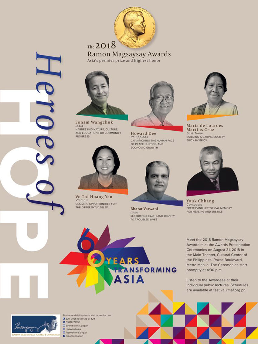 The Ramon Magsaysay Award Foundation President Carmencita Abella said the winners “are clearly Asia’s heroes of hope, moving their societies forward through their unequivocal pursuit of the larger good.