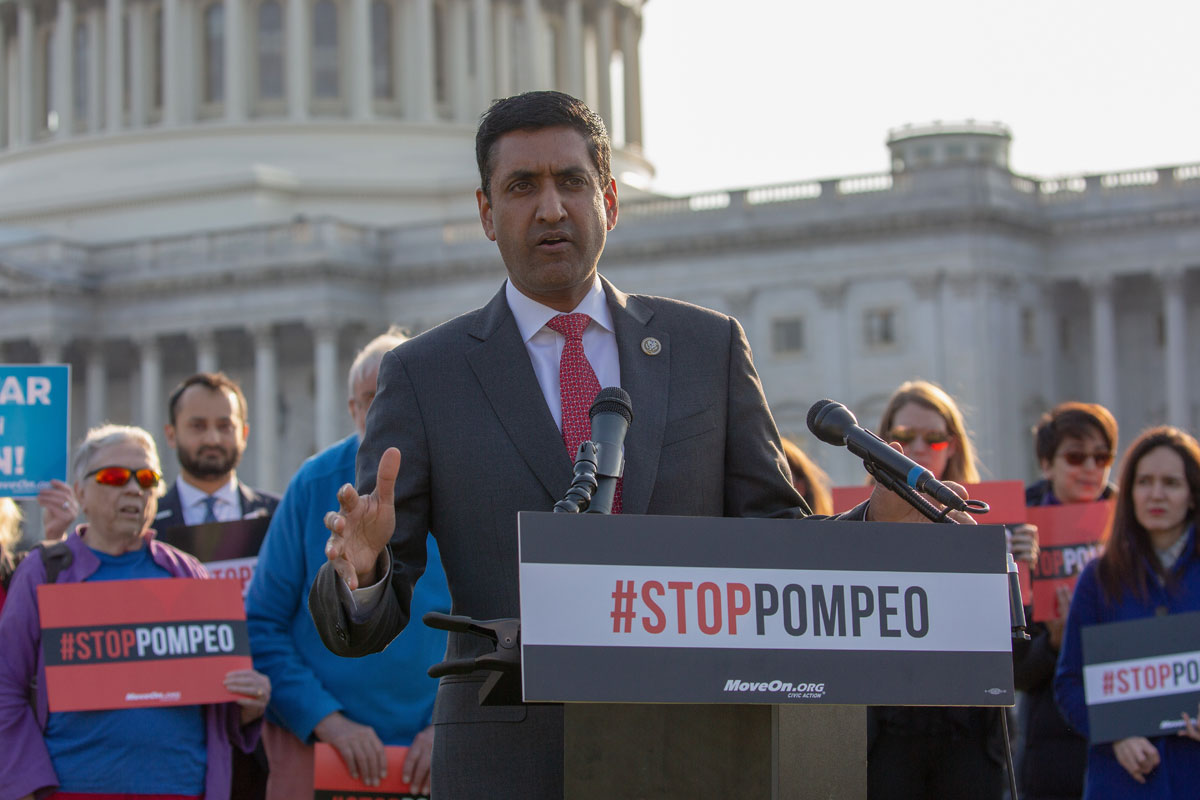Rep. Ro Khanna (D-CA) speaks at a rally with MoveOn members and allies gather with leading senators to demand that the Senate vote to reject Mike Pompeo’s nomination for Secretary of State at U.S. Capitol, April 11, in Washington, D.C.  (Tasos Katopodis/Getty Images for MoveOn.org)