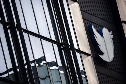 The Twitter logo is seen at the social media company’s headquarters in San Francisco on Friday, Nov. 11, 2022. (Stephen Lam/San Francisco Chronicle via AP)