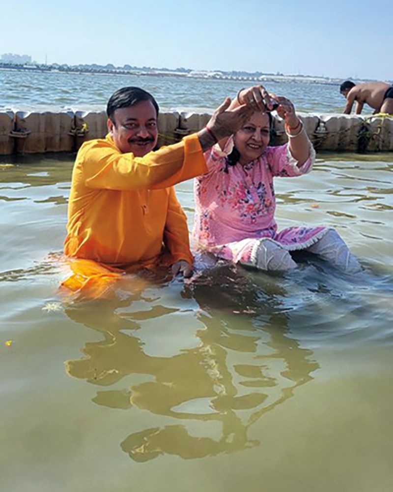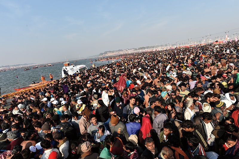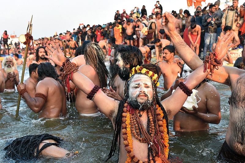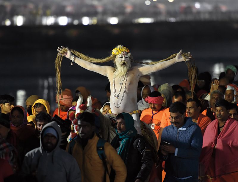 Attendees at the Maha Kumbh Mela with a “Saadhu.” (APH Images)