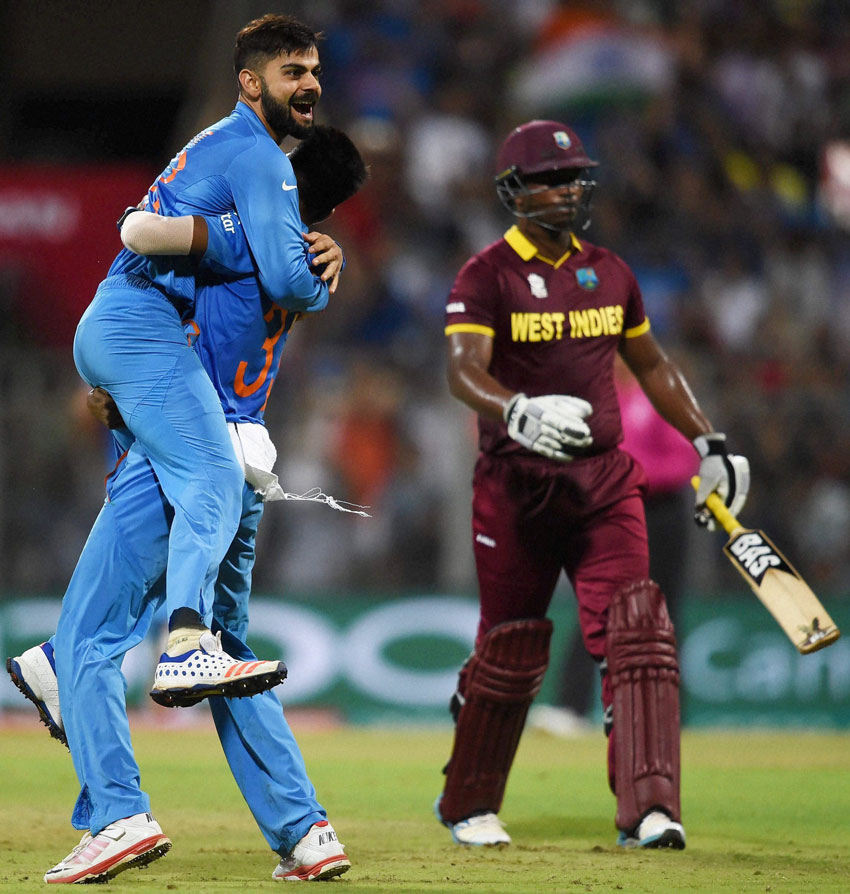 Put into bat, India rode on in-form Virat Kohli’s blazing unbeaten 47-ball 89 to notch up a challenging 192 for two, but the spirited Caribbean chased down the total and made the final with two balls to spare, leaving the capacity crowd at the Wankhede Stadium completely stunned.