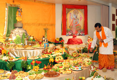 A vast array of a delicious traditional variety of foods, fruits with sweets arranged in tiers of steps in front of the idol of Krishna as Shrinath. [SHASHI DESAI/DREAMSNAPS photo]