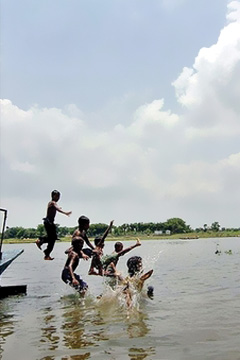 Bangladeshi kids jump into a river. A one-meter rise in sea levels would submerge a third of Bangladesh and displace millions.