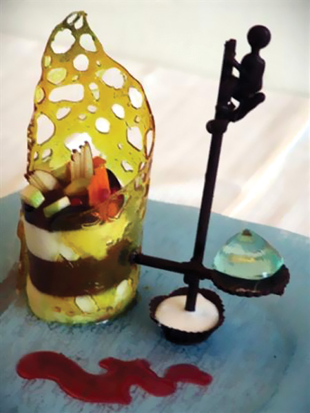 The dessert is a gold leaf Italian cassata flavored with Irish cream, served with a mango and pomegranate compote and a champagne sabayon enlighten. The dessert is decorated with a chocolate carving of a fisherman clinging to a stilt, an age old local fishing practice, and an 80 carat aquamarine stone.