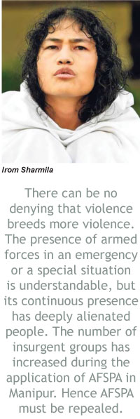However, there can be no denying that violence breeds more violence. The presence of armed forces in an emergency or a special situation is understandable, but its continuous presence has deeply alienated people. The number of insurgent groups has increased during the application of AFSPA in Manipur. Hence AFSPA must be repealed. Meanwhile, like in Kashmir and Nagaland, the central government must begin a process of dialogue with insurgent groups in earnest seeking to accommodate their political demands to the extent possible but respecting their aspirations. It may not be possible for the government to meet some of the demands, especially related to self-determination or autonomy, but a mechanism must be created which will convince the insurgent groups that the possibility of solution according to their wishes exists.